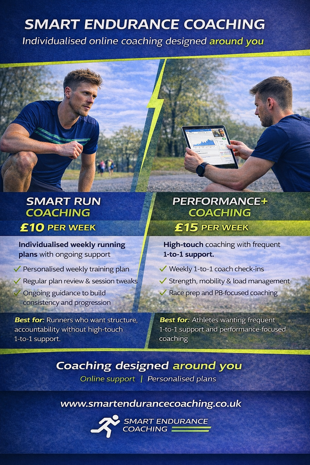 High touch service, personalised plan + frequent one to one check ins, strength & mobility support, race prep